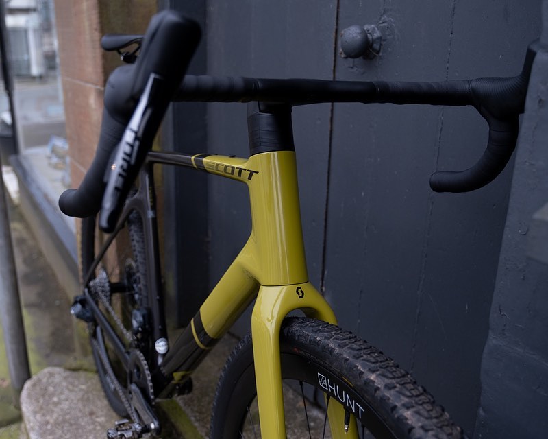 Scott Addict Gravel Tuned frameset built up with Sram Force AXS, Syncros Creston one-piece Gravel bar and finished off with Hunt Carbon Gravel wheels.